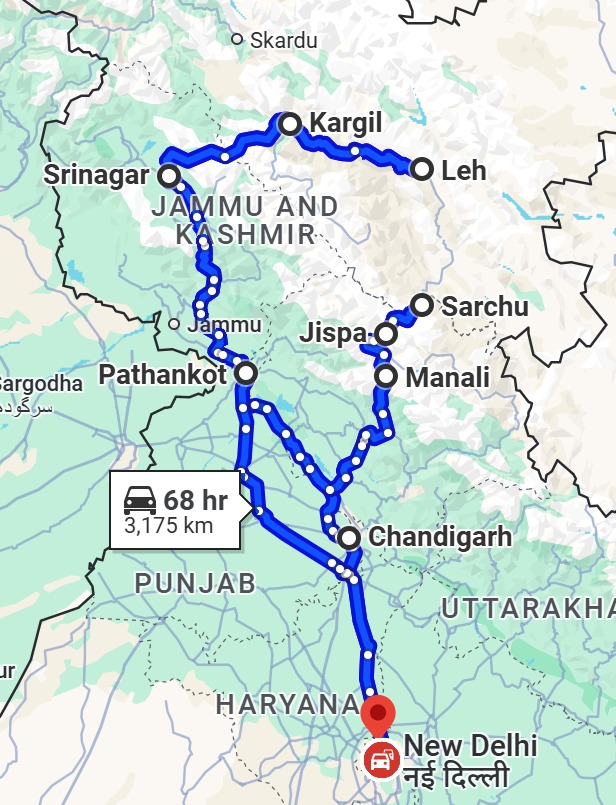 New Delhi, Chandigarh, Manali, Jipsa, Sarchu, Leh, Nubra, Pangong, Kargil, Srinagar, Pathankot